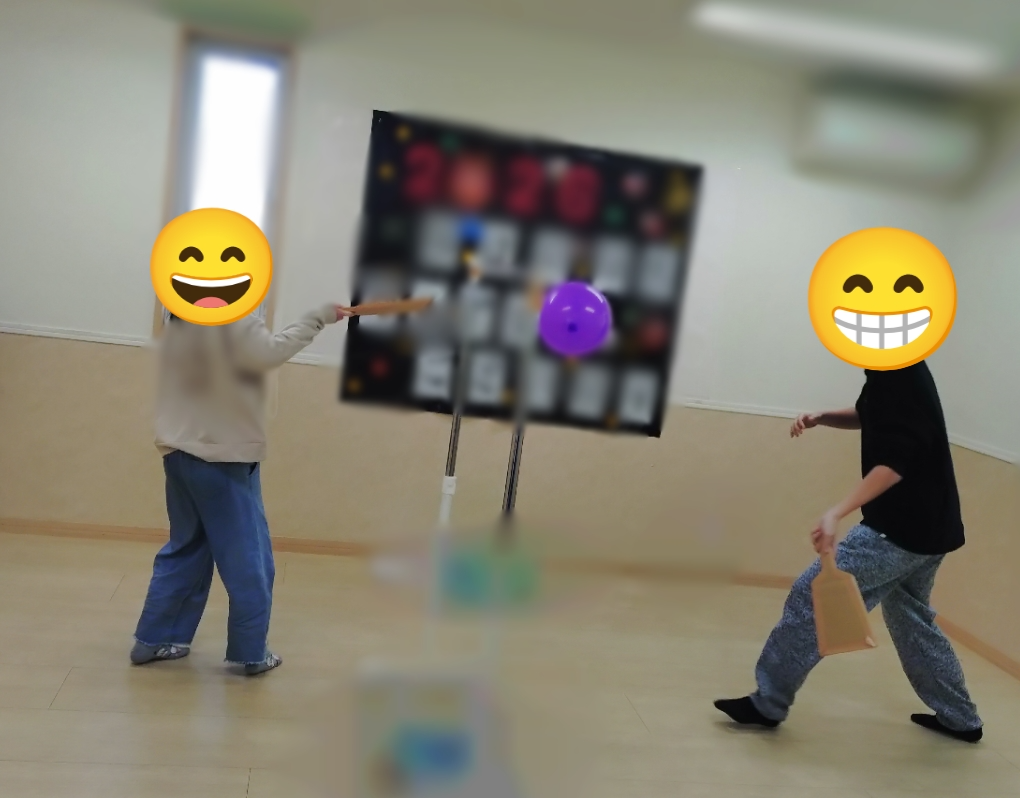 今回はお楽しみ会で「羽子板風船ラリー」をしました♪